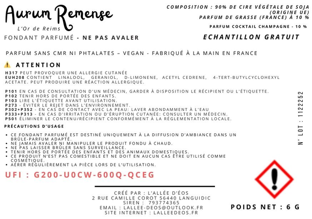 H317 : Peut produire une réaction allergique. EUH 208 : Peut contenir des allergènes naturellement présents dans les compositions parfumées.