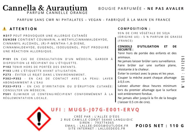 95 % cire végétale de soja (UE) - 5 % parfum de Grasse (France)