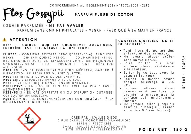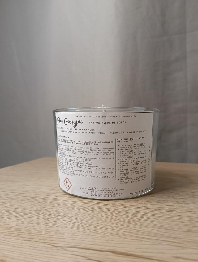 Composition : 90% Cire végétale soja (UE)- 10% de parfum de Grasse ( France) - Sans CMR, sans phtalates. Non testée sur les animaux.