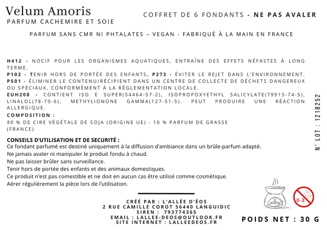 Coffret de 6 fondants – Composition : 90 % cire végétale de soja (UE) - 10 % parfum de Grasse - Durée ± 8 h ( 1 fondant)