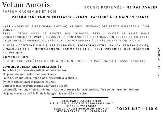 Bougie parfumée 110 g – Composition : 95 % cire végétale de soja (UE) - 5 % parfum de Grasse (France) - Durée ± 20 heures.