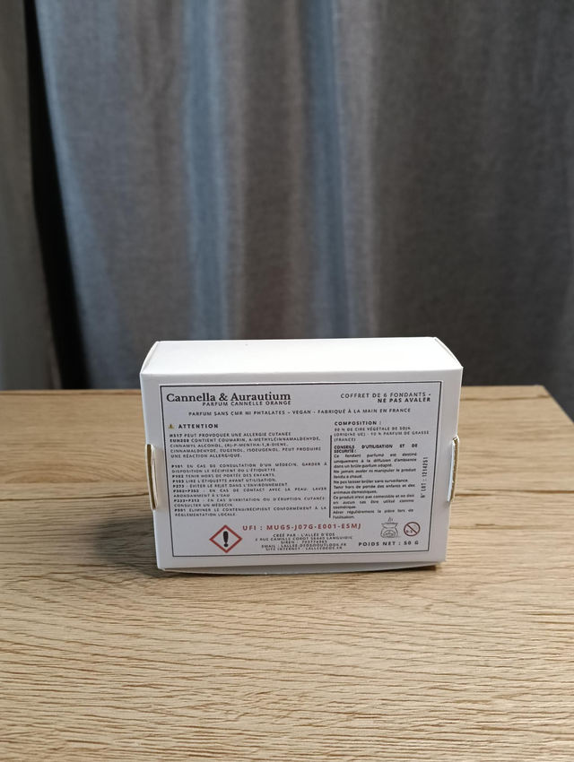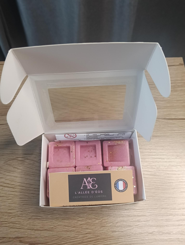 Composition : 90 % cire végétale de soja (UE) - 10 % parfum de Grasse - Durée ± 8 h ( 1 fondant)