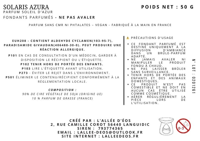Tenir hors de portée des enfants et des animaux. / NE PAS AVALER / Faire brûler sur une surface stable, plane et résistante à la chaleur. / Ne jamais laisser une bougie allumée sans surveillance. / Ne pas déplacer le brule parfum lorsque la cire est encore liquide. USAGE UNIQUEMENT POUR LA DIFFUSION DANS UN BRULE PARFUM. NON COMESTIQUE - NE PAS APPLIQUER SUR LA PEAU.