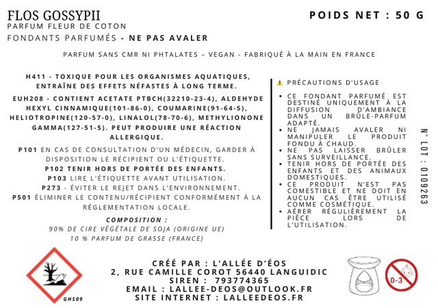 Tenir hors de portée des enfants et des animaux. / NE PAS AVALER / Faire brûler sur une surface stable, plane et résistante à la chaleur. / Ne jamais laisser une bougie allumée sans surveillance. / Ne pas déplacer le brule parfum lorsque la cire est encore liquide. USAGE UNIQUEMENT POUR LA DIFFUSION DANS UN BRULE PARFUM. NON COMESTIQUE - NE PAS APPLIQUER SUR LA PEAU.