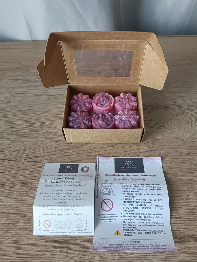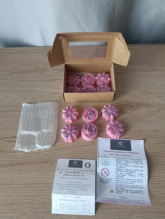 💡 Utilisation : déposez 2 fondants (env. 11 g) dans votre brûle-parfum. Utilisez une bougie chauffe-plat de 4 h max pour préserver la richesse du parfum. Diffusion : env. 6 h.